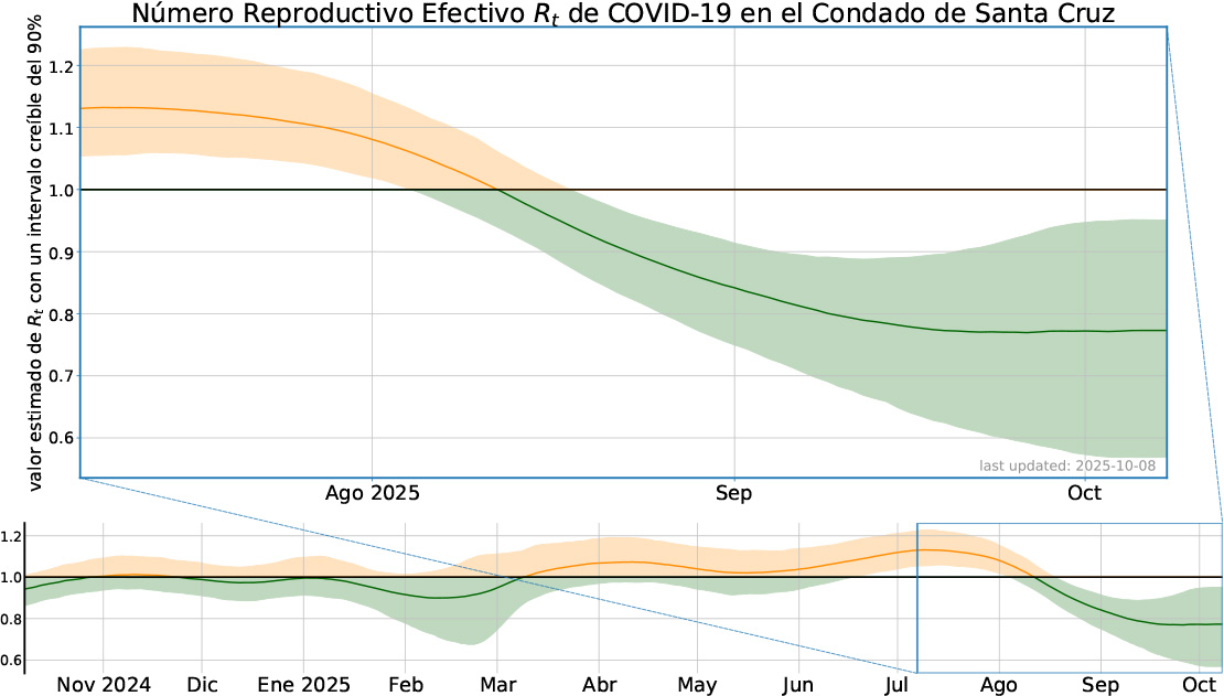 El Número Reproductivo Efectivo, que se muestra aquí como "Rt", nos ayuda a comprender qué tan rápido se está propagando COVID-19 en nuestra comunidad. Para COVID-19, Rt nos dice el número promedio de personas que contraerán esta enfermedad de cada persona infectada.