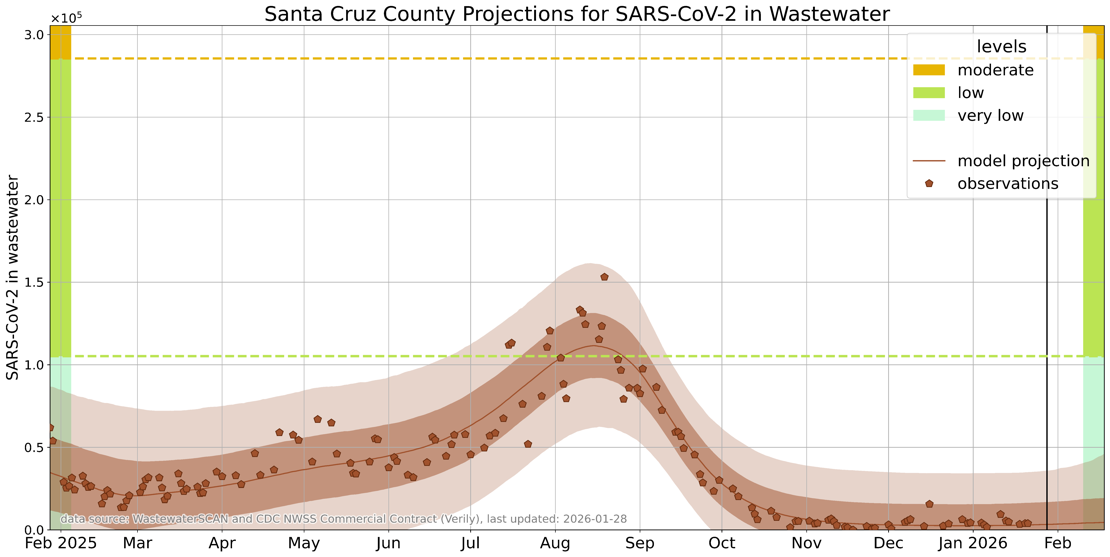 The wastewater activity levels “Very Low,” “Low,” “Moderate,” “High,” and “Very High” follow the CDC’s system for tracking virus levels in wastewater. This system converts local wastewater data into a measure called the Wastewater Viral Activity Level (WVAL), which shows how current levels compare to the county’s low viral levels. We calculate this by averaging the wastewater virus concentrations from our three treatment plants (City of Santa Cruz, Santa Cruz County, and Watsonville), weighted by the population each plant serves. Periodically, we update our “low” baseline using the lowest 10% of values from past data. We then compare the current average to that baseline, accounting for normal variation in the data. The results fall into one of five activity levels. To learn more, visit the CDC’s data methods page: cdc.gov/nwss/data-methods.html