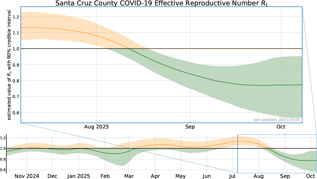 How to read the plot: The plot shows green (for good) when Rt is below 1 and COVID-19 spread is decreasing. When Rt is above 1 and COVID-19 spread is increasing, the plot is yellow (take caution). The darker line shows the most likely Rt in Santa Cruz county. Since models are not perfect, the shaded areas around the darker line show the range of likely Rt values. Please note that case data from the last 7 days are frequently updated and are excluded from the estimation of Rt.